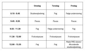 I de dage I er her, vil I blive undervist af nogle af vores dygtige og søde lærere på hold, hvor I er sammen med jeres kammerater. I vil også få mulighed for at komme med ud og følge undervisning, så I kan få et indblik i, hvordan et helt almindeligt modul er her på Midtfyns Gymnasium.